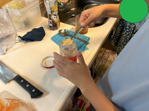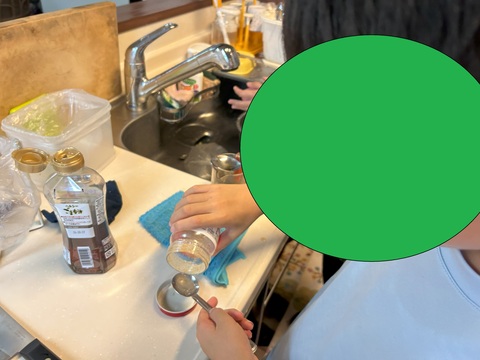 生徒はごま油と同じ方法で鶏ガラスープのもとを計量スプーンでとろうとしました。