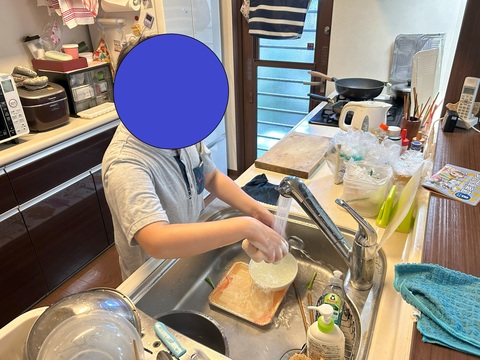 以前、もくもくファームで皿洗いが上手いと褒められた生徒は、自信もって皿洗いをしていました。